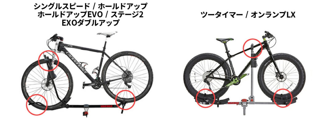 シングルスピード・ホールドアップ・ホールドアップEVO・ステージ2・EXOダブルアップは、前輪2か所と後輪1か所で固定します。
