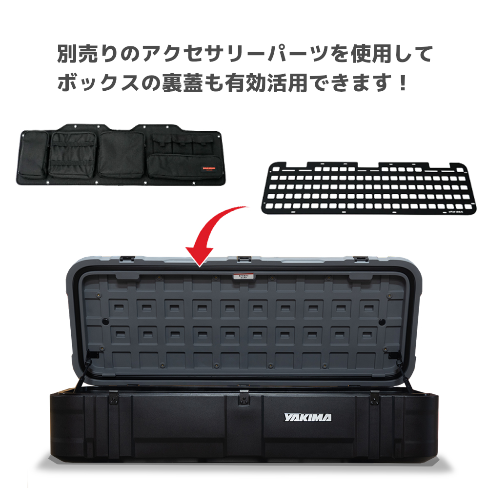 ・蓋の内側にはギアの固定に便利なメッシュパネルや小物の収納に便利な収納バッグの取り付けが可能で、収納面でも優れています。